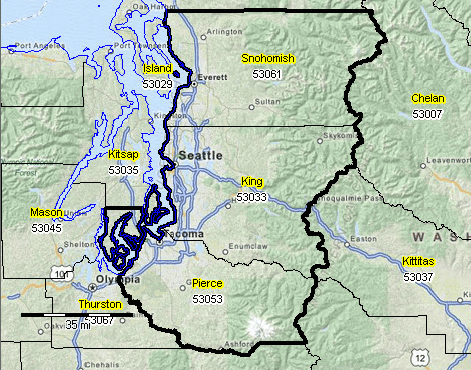King County: Seattle, Bellevue, Kirkland, Redmond, Renton, Kent, Auburn, Federal Way, Sammamish, Issaquah, Mercer Island, Shoreline, Lake Forest Park, Bothell, Woodinville, Kenmore, Newcastle, SeaTac, Tukwila, Burien, Des Moines, Covington, Maple Valley, Black Diamond, Enumclaw, North Bend, Snoqualmie, Vashon Island