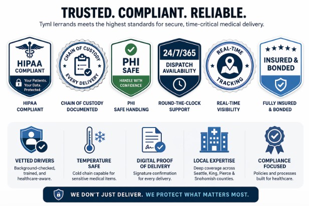 Not every medical delivery is an emergency — but every delivery matters. Tyml Ierrands offers healthcare organizations in Seattle a single, reliable courier partner for both ends of the urgency spectrum: emergency STAT dispatch when minutes count, and scheduled non-emergency delivery that keeps your operations running without disruption.
