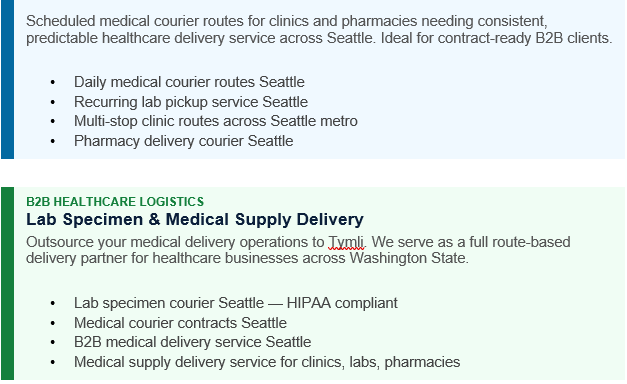 Tymli provides same-day and scheduled medical courier services across Seattle, Tacoma, Bellevue, Renton, and Kent — serving clinics, labs, pharmacies, and healthcare providers that need reliable delivery partners, not one-off apps. Whether you need emergency STAT medical delivery or recurring daily lab specimen routes, Tymli operates as your dedicated B2B healthcare logistics company in Seattle.